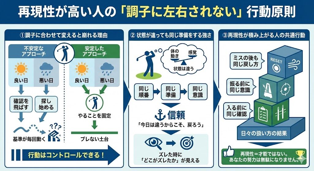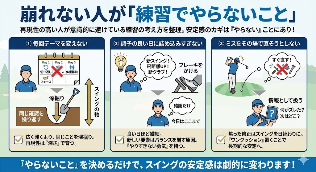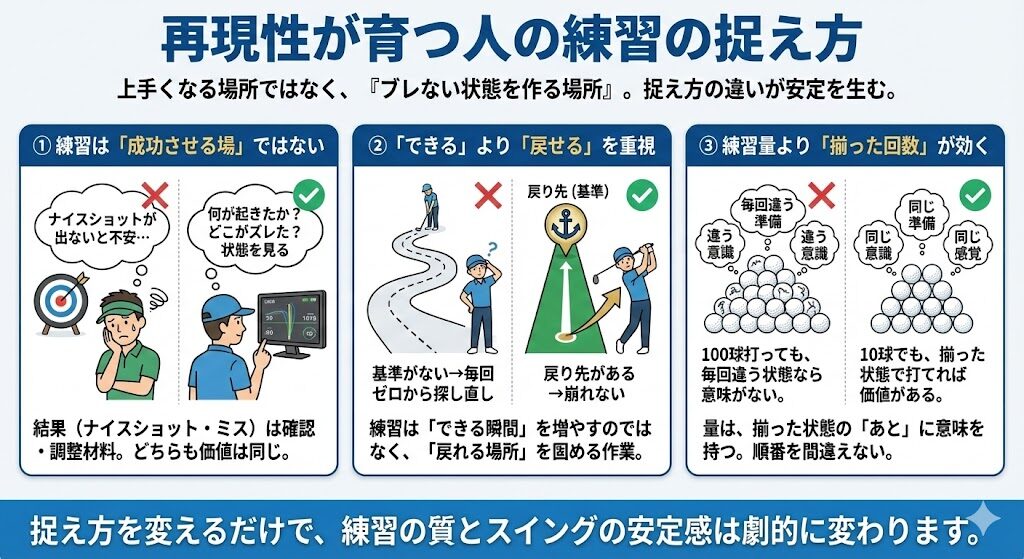 【ゴルフ上達⓰】スイングを崩さない人の習慣|再現性を育てる練習の考え方