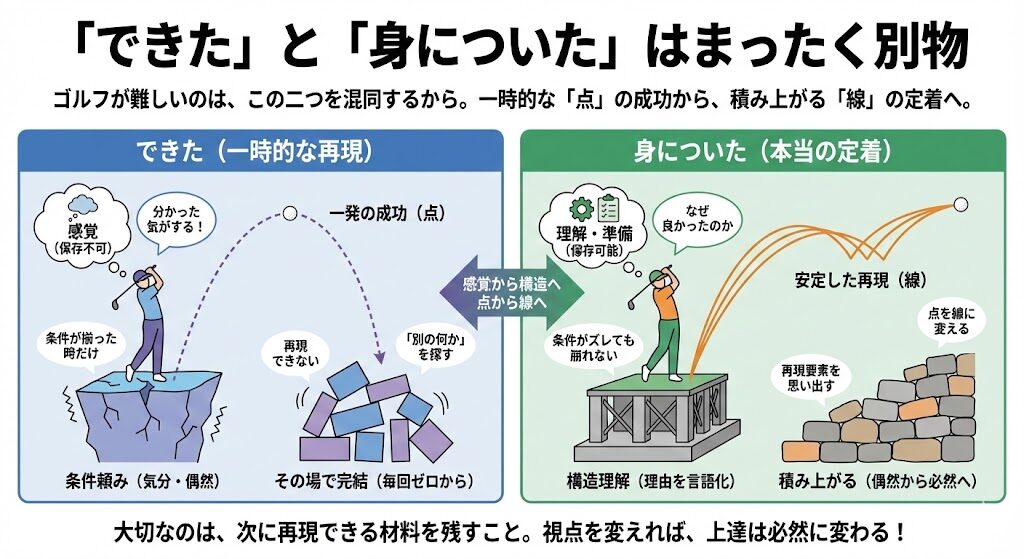 でも次の練習やラウンドでは、なぜか同じように打てない。